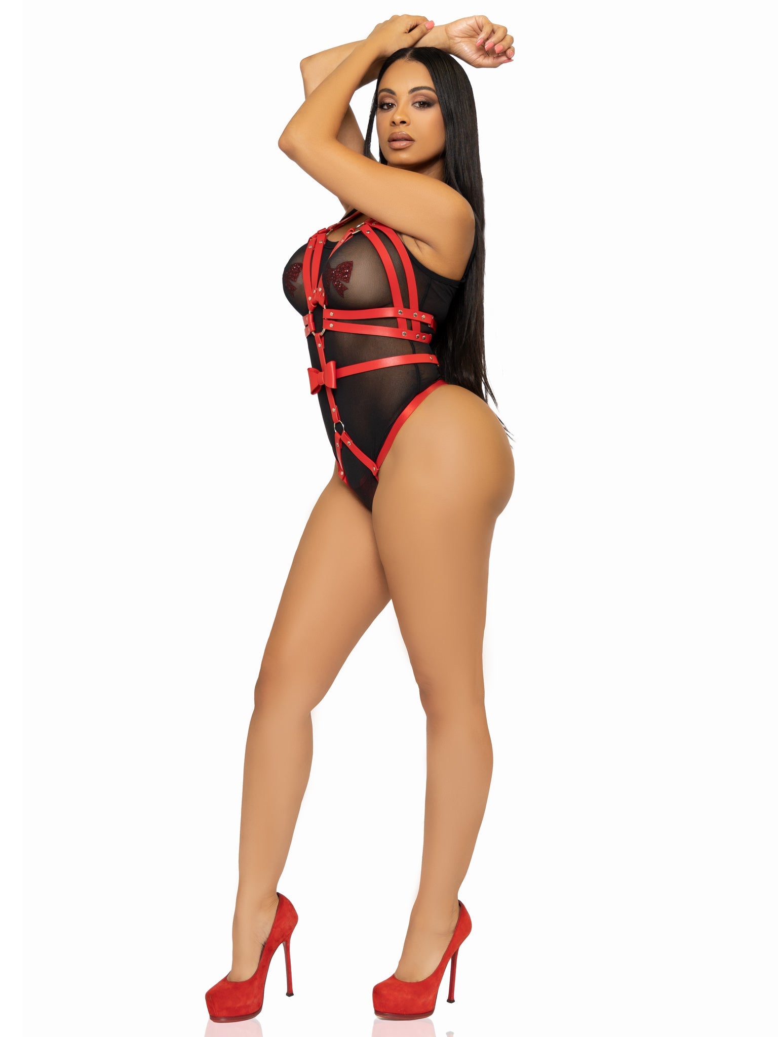 Take charge with the ultra-sexy vegan leather studded harness lingerie teddy by Leg Avenue. Daring and versatile, this hot lingerie body harness features multi-strap details and bow accent, adjustable straps, and a snap off panty. Pair over clothing as an edgy accessory or on its own for bedroom fun. Nipple pasties not included.