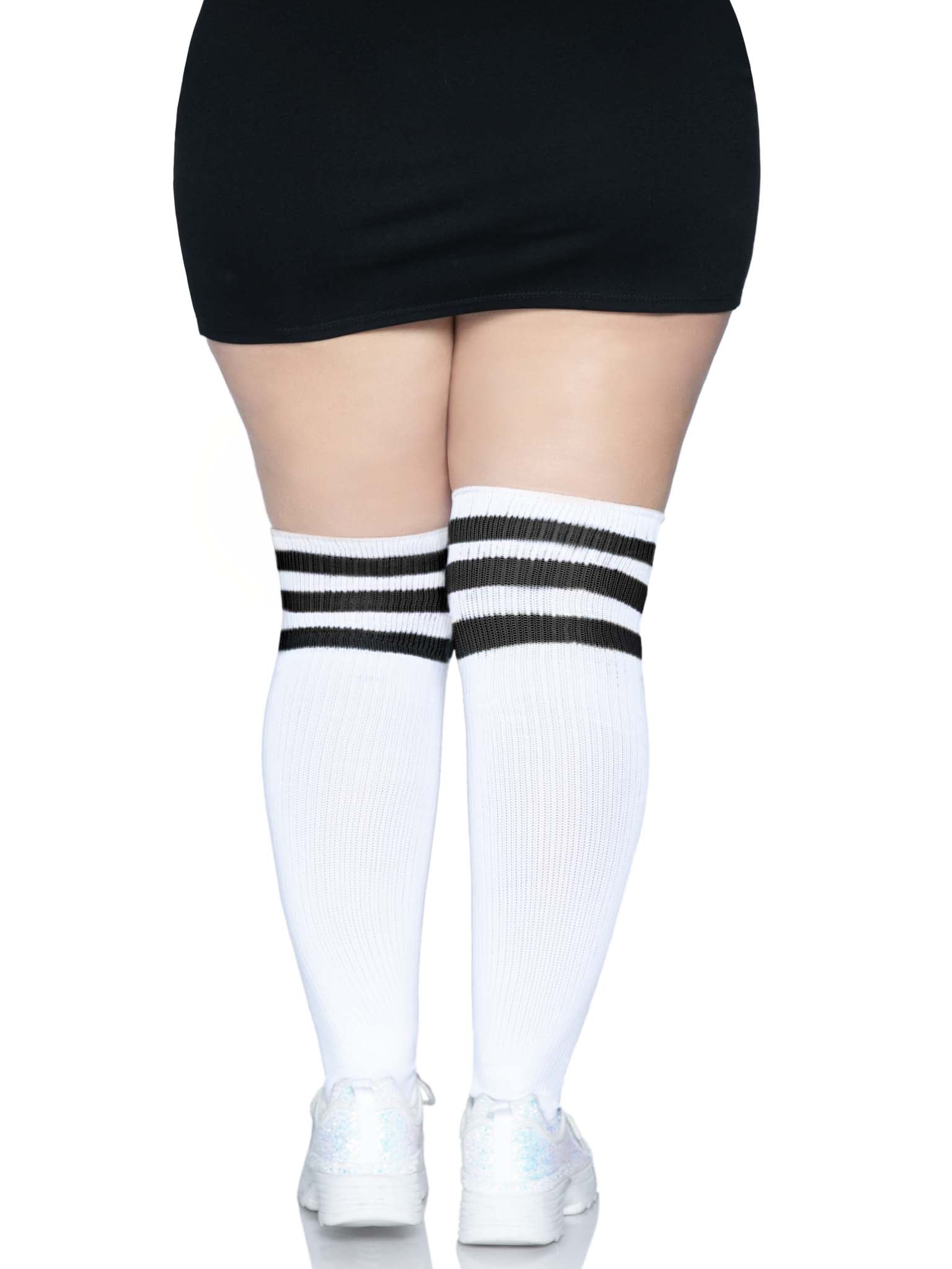 Take your shot with the Kellee plus size over the knee athletic socks by Leg Avenue. Featuring the classic 3 stripe top, you can add a sporty vibe to any look with these fun womens socks.